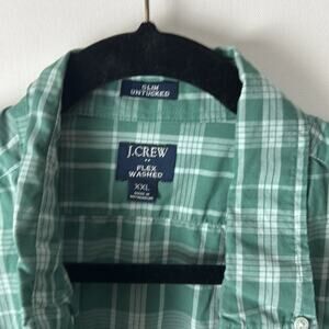 Gently Used J. Crew Button Down Shirt. This is a men’s XXL. Green and white plaid design throughout. Front pocket. 98% cotton, 2% elastane.