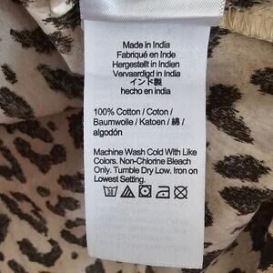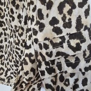 Excellent condition. Buttons and ruffle detail on bodice. Layered sleeve detail. Button cuffs. Leopard print.