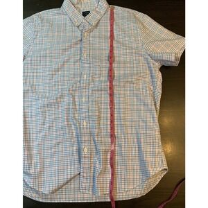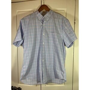 J Crew Button Shirt Mens XL 17-17.5 Flex Short Sleeve Blue Pink Check Stretch