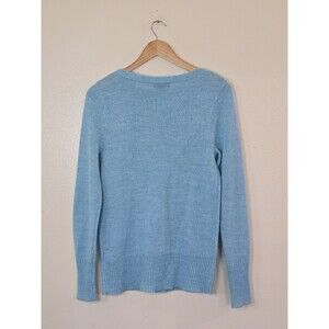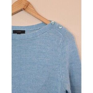This J. Crew Button Shoulder Wool Mohair Sweater in women's size medium is a stylish and versatile piece perfect for various occasions. The sweater features a boat neck with button accents, making it a trendy and classic choice. Made with a tight-knit fabric of mohair, wool, and acrylic, it offers warmth and comfort during the winter, fall, and spring seasons. Its solid light blue color and preppy theme make it a perfect addition to any school, university, or city wardrobe. The sweater is lightweight, stretchy, and breathable, making it a must-have for the fashion-forward woman.