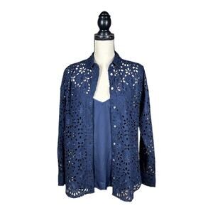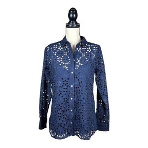 J. Crew Button Up Shirt in Embroidered Eyelet w/ Matching Cami. In a size 6. Has a collar with eight buttons down the front. Three button at each cuff. Underlay cami. Measures approx. 18" armpit to armpit, 26 1/2" in length. Cami: 17" armpit to armpit, 24 1/2" in length. In great condition. 53% Polyester, 47% Cotton. In great condition.
