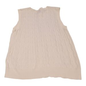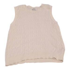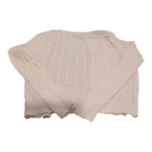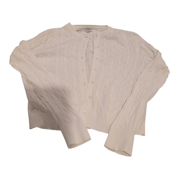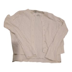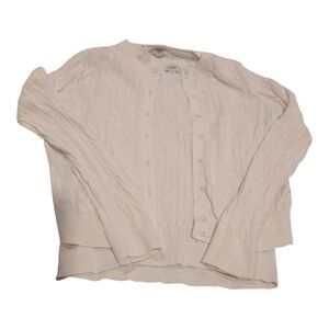 Classic cable knit cardigan with front buttons. Soft off-white color. Lightweight and versatile. Timeless wardrobe staple.GUC