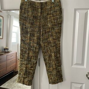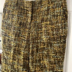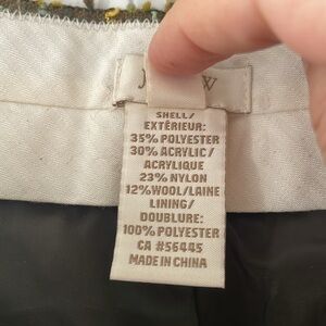 From JCrew: Our cream-of-the-cropped café capri, now in a fabulous technicolor tweed that we can't get enough of. Pair it with a silk blouse in a happy hue or a sequin blazer for an eye-catching (and totally touchable) play on textures. Poly/acrylic/nylon/wool. Belt loops. Zip fly. Slant pockets, back welt pockets. Fully lined. Import. Dry clean.