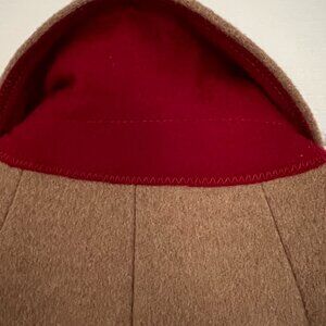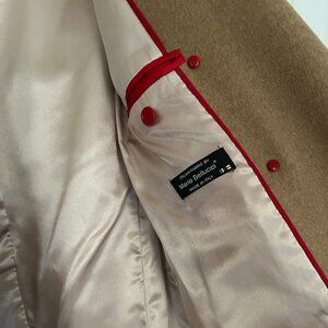 Mid-length, double-breasted camel / tan wool coat by J. Crew. Lined in pink satin/silk with red detailing. Italian fabric by Mario Bellucci. Size 4, measurements below. Like new, rarely worn. Comes from a smoke-free, pet-free home.
