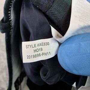 Gently worn with no obvious stains, holes, or snags visible. Fabric, lining, seams, and pockets all appear intact with rich color and crisp plaid pattern.