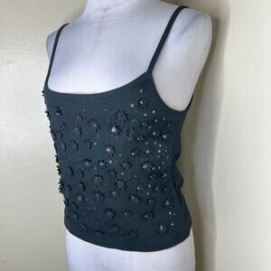J Crew Cami Tank Top Large White Floral Embellished Vintage Ribbed Scoop Neck