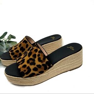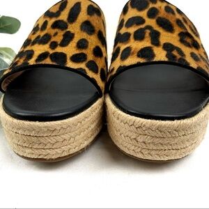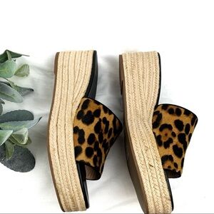 These super cute platform sandals feature a real calf hair vamp in an animal print, leather inner sole with a slight cushion, and a woven espadrille like platform in a natural jute color.