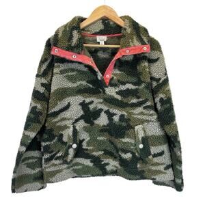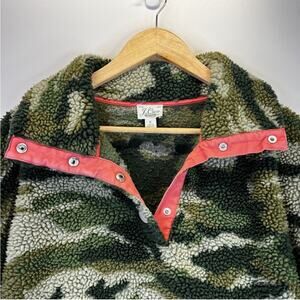 J.Crew Camo Printed Sherpa Jacket in Green. Combines warmth and style with its plush green camo-printed sherpa fabric. Designed for both comfort and versatility, this jacket features a high neckline, long sleeves, and an exposed front button-down placket. Cozy handwarmer pockets while the bright contrast trim on the placket lends a modern touch.
