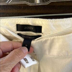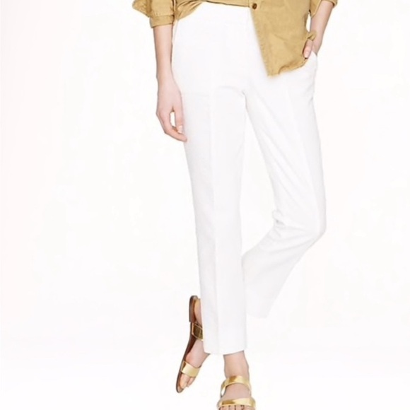 Experience the perfect blend of style and comfort with these J. Crew white chinos. Crafted from lightweight cotton, these pants offer a sleek, flat-front design ideal for business casual or everyday wear. Their versatile neutral tone makes them easy to pair with a variety of tops and shoes. Notice one bottom hem is particularly needs to be sown up. Super easy fix. My machine broke so I never fixed it