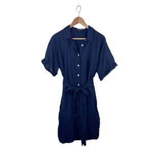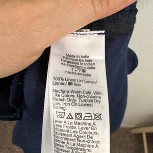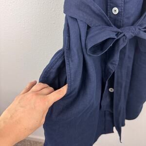 100% linen, button front closure, short sleeves with drop shoulder, pockets, size medium.