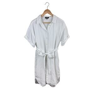 100% linen, button front closure, short sleeves with drop shoulder, pockets, lined, size medium.
