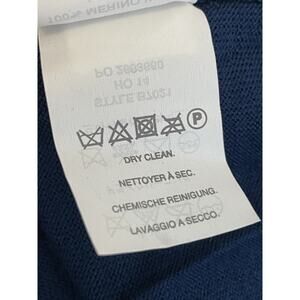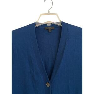 Gently pre-owned J. Crew long sleeve cardigan sweater in deep blue. 100% merino wool lightweight tight knit that's slightly sheer. Longline tunic with button closure and v-neck. Patch pockets on front. Tie detail on back with knit strap, use to adjust fit. In good used condition.