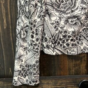J Crew brand Caryn cardigan sweater. Size large. Floral print. Black & white. Button front. Stretch cotton. Long sleeves. Dress up or down. Great layering piece for the office or casual wear. Preloved. Please see all photos for condition.