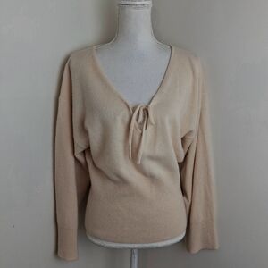 Elevate your style with this elegant V-neck sweater. Featuring a chic tie detail, this tan sweater is perfect for any occasion. Stay cozy and fashionable.