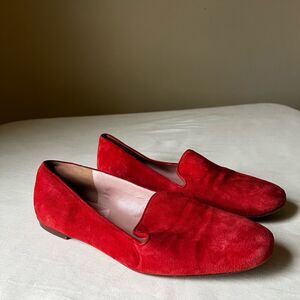 J.Crew red suede loafers, women's smoking slippers, suede flat shoes size 7, slip on red loafers, classic casual chic flats, versatile everyday shoes, preppy suede slippers, minimalist loafers