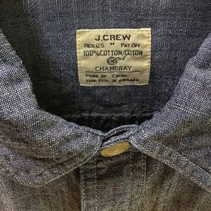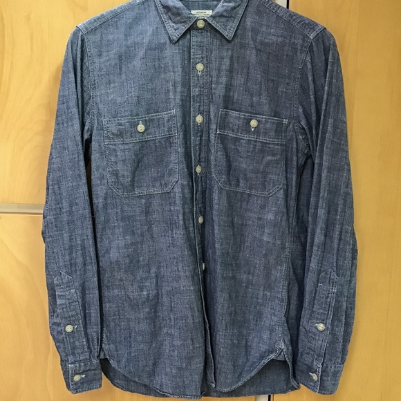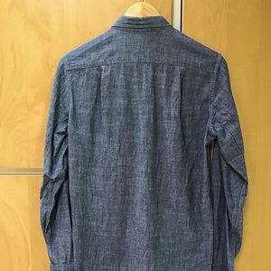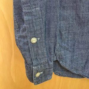 Light blue Chambray cotton work shirt, with 1920's style extra collar button. Lightly worn. Slim fit XS