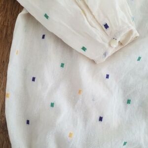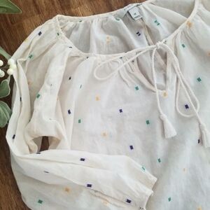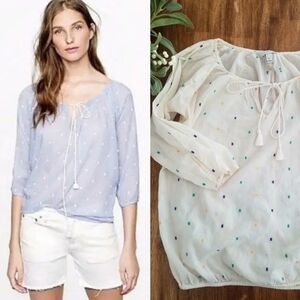 J Crew Chambray Dot Peasant Tassel Blouse Embroidered Ivory Top