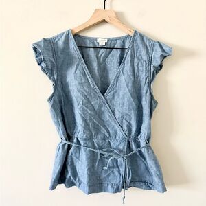 J. Crew Chambray Faux Wrap Peplum Blouse Ruffle Sleeve in Blue Size 12