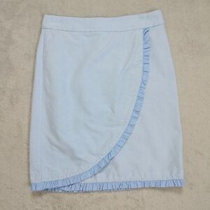 Chambray Light Blue Petal Wrap Ruffle Skirt from J. Crew. Features light blue chambray, invisible back zipper, back darts for fitted look, ruffle edging and 100% Cotton. Cover Shot is Representative of Fit Only—See All Pics of Actual Skirt.