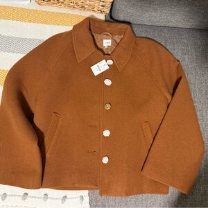 An iconic J. Crew swing coat crafted from Italian stadium-cloth wool, designed for warmth and sculptural elegance. The evergreen hue is timeless yet modern, framed by a faux-fur trimmed hood and gold hardware. A-line silhouette, zip and snap closures, and deep pockets make it both functional and refined.