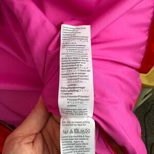 Poppy red with gold-tone hardware, full zip front closure, stand collar, removable sherpa-lined hood, several pockets, cinch cord at waist, ribbed cuffs with thumbholes, side zippered vents, size small.
