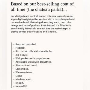 "Based on our best-selling coat of all time (the chateau parka) our design team went all out on this new insanely warm, super-lightweight puffer version with a cozy sherpa-lined removable hood, flattering drawstring waist, pop color linings and lots of pockets. Even better? It's filled with eco-friendly PrimaLoft, so each one we make keeps 15 plastic bottles out of oceans and landfills.