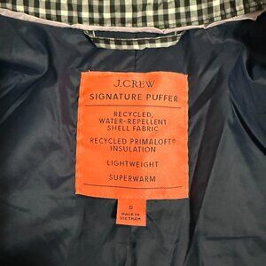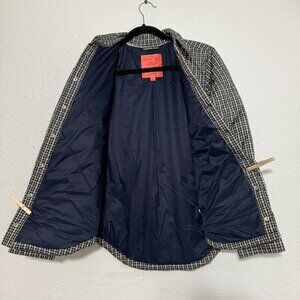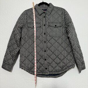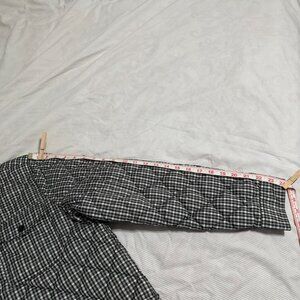 Stylish checkered puffer with snap buttons. Features chest pockets. Perfect for chilly days.