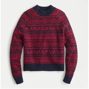 J Crew Cheerful Fair Isle Mock Neck Lambs Wool Sweater Red Blue XS Extra Small