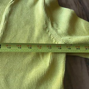 The 3rd photo showing a closeup of the label looks to be the truest color of the sweater. It's a mustard yellow, chunky knit with pockets near the bottom on the sides. Overall, great condition. See photos of measurements.