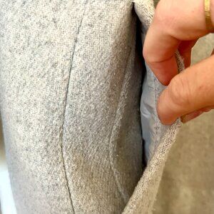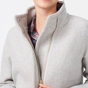 Beautiful light heather grey winter coat from J Crew Factory. Retailed for $235. This coat has some typical wear and tear for age (about a year old). Some pilling as seen in pictures, tiny light brown mark below right side zipper and slight discoloration to right on the jcrew tag on the inside (both photographed) and some light wear on the gold zipper. Got SO many compliments on this coat and it still has a ton of life left! Size 4P, I'd say fits between a 2 and a 4. Factory description below-