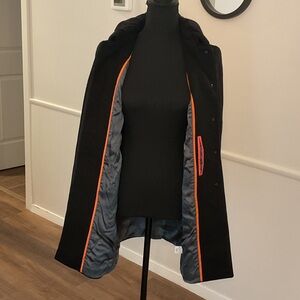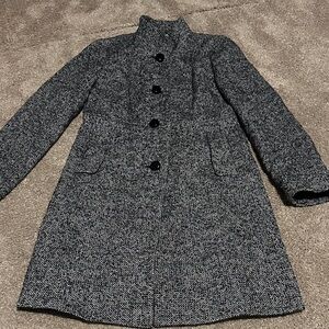 Timeless black pea coat by J. Crew. Features a sleek design with a cozy collar. Ideal for versatile styling.