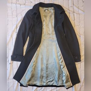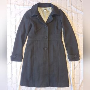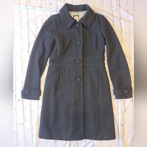 Fully lined black wool coat. Fitted around waist for very cute fit. Features button closure and tailored fit. Two exterior pockets.