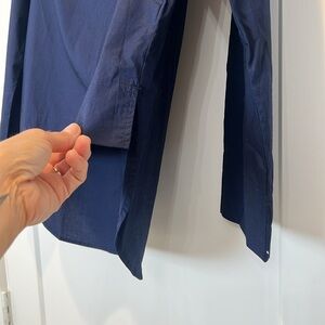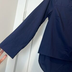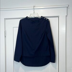 Elegant J. Crew navy blouse size 2 with a sleek design. Ideal for versatile styling. This blouse is so nice! Made of 100% Colton and has a hi low design. It also has buttons on the shoulder for such a cute touch! In perfect condition!