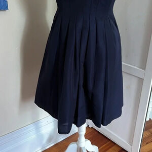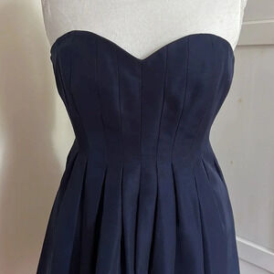 New with tags, J. Crew Special Occasion Dress in navy blue. This strapless dress has a silicon strip to help keep the dress in place. Cotton blend fabric with pockets. Zip closure.