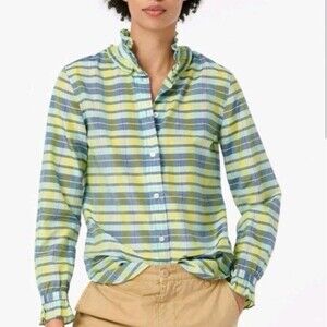 J. Crew Classic-Fit Silk-Cotton Voile Ruffleneck Shirt Sz 4 Spring Plaid Preppy