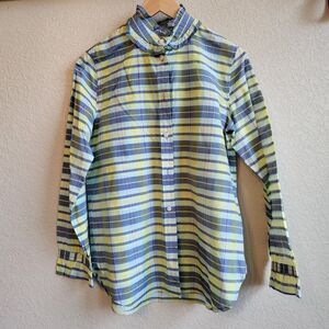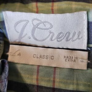 The J. Crew Classic-Fit Silk-Cotton Voile Ruffleneck Shirt in size 4 is a versatile and stylish addition to any woman's wardrobe. The shirt features a classic fit with a collared neckline, long sleeves, and a button closure. Made from a lightweight and breathable blend of silk and cotton, this shirt is perfect for all seasons and occasions, from casual outings to business meetings. The spring plaid pattern adds a preppy touch to the overall look, making it a timeless and stylish choice for any woman looking for a classic yet fashionable top. Pre-owned