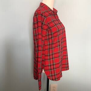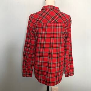 We love this holiday-ready take on J. Crew's newly updated classic-fit shirt (which has a little extra room and a just-right length)—not to mention the fact that it's crafted in a cozy, cold-weather-friendly flannel. Red with a tartan plaid print in back, blue, yellow and white. Button front and cuffs. In excellent condition
