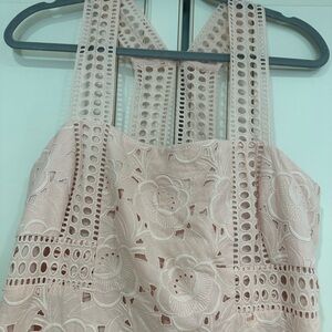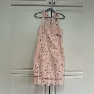Gorgeous J. Crew Collection Black Label Austrian Eyelet Maxi Dress in pale pink. More midi length than maxi length. Excellent condition without flaws or any signs of wear. This gorgeous dress is crafted in eyelet from Hämmerle & Vogel, the Austrian fabric house that's been making beautiful textiles and embroidery since 1900. Details include Y-shaped straps, a nude lining and a stylish tea-length hem. The absolute perfect dress for weddings, showers, engagement photos, Easter, special occasions. Sleeveless Concealed back zipper and hook closure Concealed hook connects straps in back Fully lined with sheer lace panel under knees Sheer hem High quality eyelet lace 100% Cotton 100% Polyester lining Dry clean only