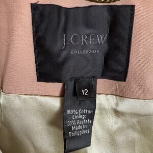 Step out in style with this elegant, retro J. Crew Collection Icon Trench Coat Jacket! This light khaki jacket, in a women's size 12, features a classic button closure. It's pre-owned but in good condition, ready to add a touch of sophistication to your wardrobe. Please note that the belt is missing.