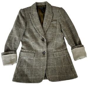 Rare J. Crew Collection Irish mill Magee of Donegal 100% wool houndstooth blazer women’s size 2. Classic preppy olive green and grey weave. Lined in pure green silk, grey felted collar, contrasting pinstripe sleeves if you choose to roll the sleeve cuffs. Longer length with two-button closure. Excellent condition with no flaws of note.