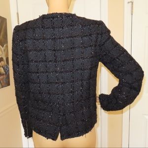 Nylon/wool blend cropped evening jacket, collarless, shiny thread throughout, front zipper, four front zipper pockets, zipper on each sleeve, raw edges. NWT. Price is firm. NO COUNTEROFFERS.