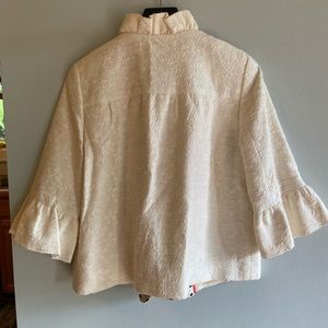 Gorgeous jacket, new with tags! Has been stored, but in pretty perfect condition. Elbow sleeves, button front, textured fabric with full lining. Hits at hip.