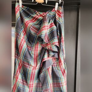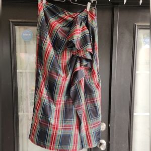 J Crew Collection Long Ruffle Skirt in Black Stewart TartanHow to get all dressed up, minus the dress? This holiday party-ready tartan skirt with a ruffle cascading down the side. Plus, it's crafted from recycled materials, like plastic bottles, fabric scraps and old clothes.Sits at waist.