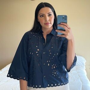 J. Crew Collection Navy Button Up Eyelet Poplin Top