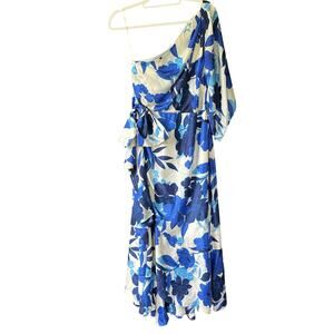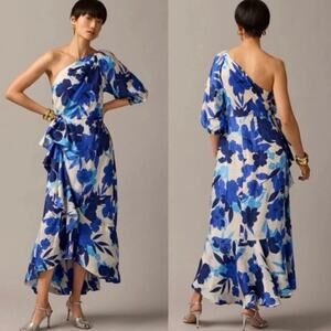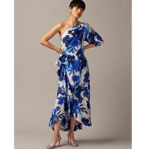 J. Crew Collection One Shoulder Ruffle Dress Floral Blue Womens 12 Maxi Elegant