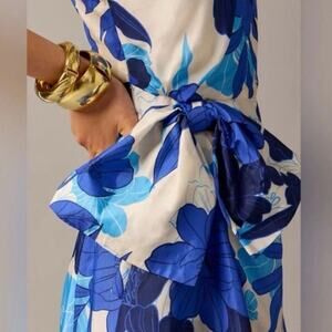 J Crew Collection One Shoulder Ruffle Blue Floral Dress, This dress is very flattering, the waist is slimming with a bow detail and elongated you with the ruffle from the waist down to the hem and around the hem. Size 12
