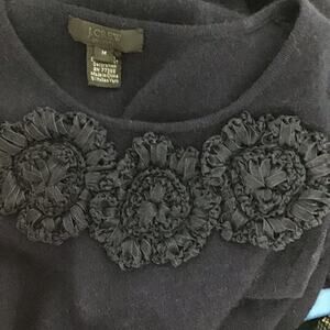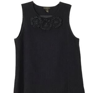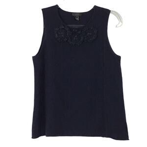J. Crew Collection Italian Cashmere Navy Blue Sweater Tank Shell Top sz M. Classic cashmere sweater shell/tank, this version can be layered over everything, from tees to button-downs to dresses, or wear it alone under a cardigan or blazer, even a jean jacket for dimension. Dark navy blue, crochet flower embellishment on scoop neckline for flair. 100% pure cashmere, dry clean only. Impeccable and in perfect brand new condition!