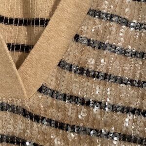 J Crew Collection, beige collared sweater with navy stripes and clear sequins throughout. Not itchy. Worn once.