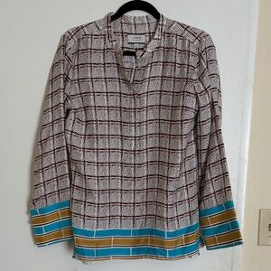 Chic J. Crew top with a checkered design. Features a vibrant hem with blue and gold accents. Ideal for versatile styling.