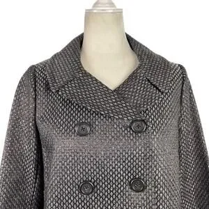 J. Crew Collection Stormy Tweed Lille Overcoat Silk Blend Coat Gunmetal Metallic Gray Size 10. J. Crew Collection black label coat features a beautiful silver and gunmetal gray metallic jacquard exterior. Double breasted front button closure with contrast floral panel in the lining to give this masculine coat a feminine touch. The large pleat at the back gives the coat a beautiful shape. Fully lined in silk.